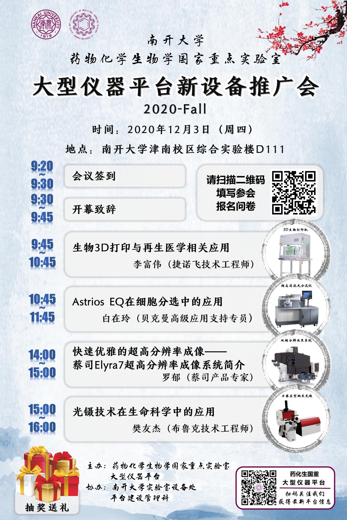 由药物化学生物学国家重点实验室大型仪器平台主办,南开大学实验室设备处平台建设管理科协办的“药化生国重大型仪器平台新设备推广会(2020-Fall)”将于2020年12月3日举办。